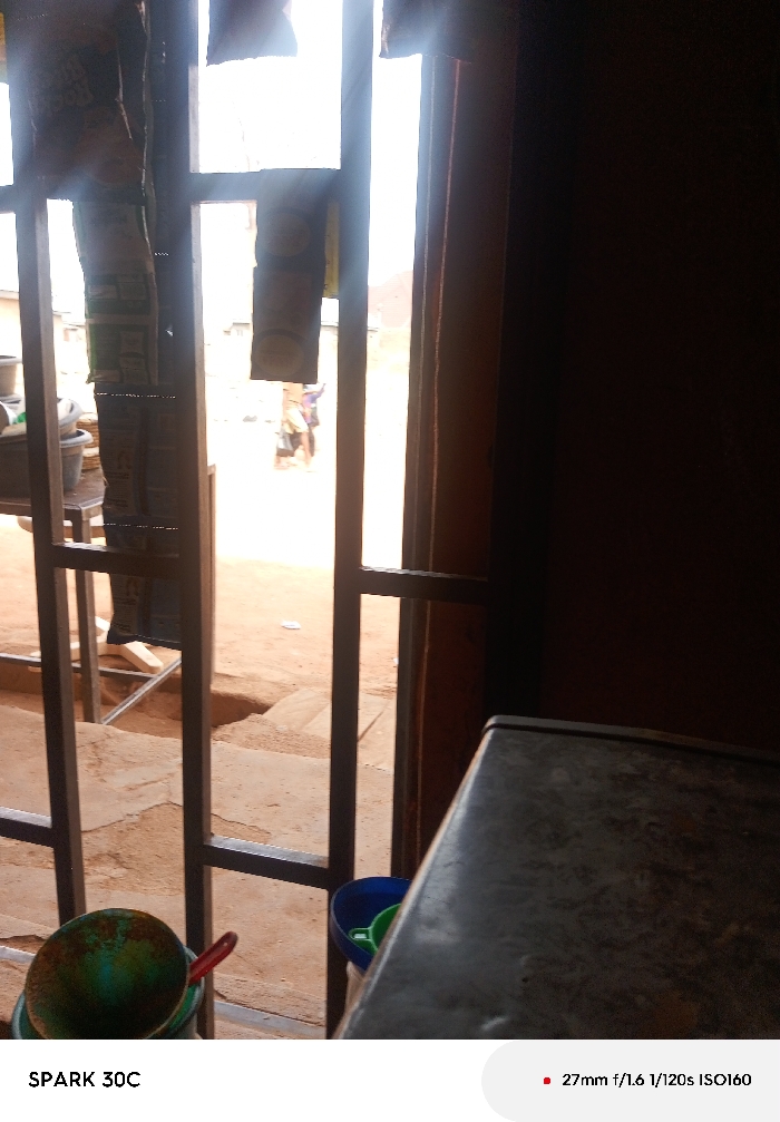 The image depicts a static scene viewed from a dimly lit interior looking out through a barred opening into a bright outdoor environment in the city of Unknown, Unknown. In the immediate foreground, on the left, rests a greenish-blue bowl containing a red utensil. To its right, a blue bucket holds a green plastic object. The lower right foreground shows a dark, textured surface, appearing to be a countertop or table. The central focus is a metal-barred window or doorway, through which the exterior is visible. Several rectangular packages, consistent with consumer goods, hang from the upper horizontal bars. Beyond these bars, the ground outside is composed of reddish-brown dirt, with some uneven patches and faint indications of concrete or steps. To the left, outside the opening, a stack of dark, round containers sits on a stand. In the bright, somewhat overexposed background, two indistinct human figures are discernible on what appears to be a dirt path. Faint outlines of distant structures are also visible under the ambient daylight. No specific actions or interactions are clearly occurring.