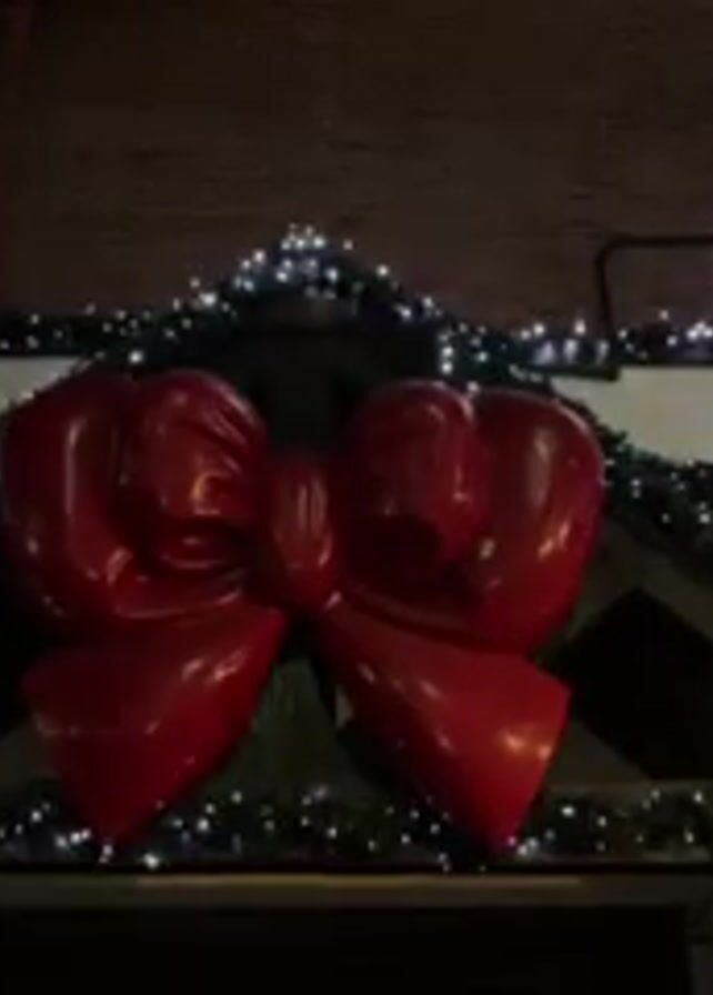 building decorated for Christmas. A large red bow adorns the apex of the building's entrance. String lights line the edges of the roof and windows, adding to the festive ambiance. The building's facade appears to be brick with white trim. The video is shot at night.