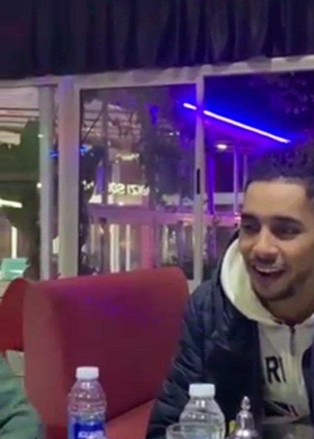two men sitting at a table inside a restaurant. The man on the right is wearing a black jacket over a white sweatshirt and has curly hair. He is speaking. The man on the left is wearing a green shirt and glasses. He is smiling and sticking his tongue out. There are plates and drinks on the table. The restaurant has red booths and a large window overlooking a street with trees. The lighting is dim.