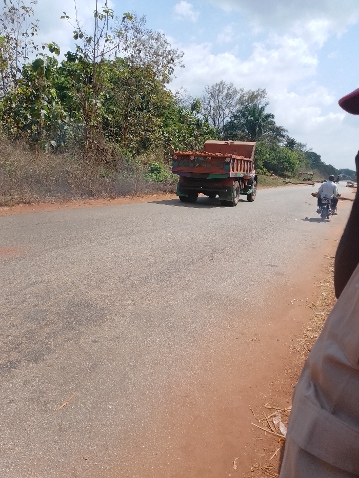 The image depicts a daytime scene on a paved road in Ejule, Nigeria. A two-lane asphalt road extends into the distance under a partly cloudy sky. In the mid-ground, a weathered orange and green dump truck, carrying reddish-brown material in its open bed, proceeds away from the viewer in the left lane. Further down the road, in the right lane, a person on a motorcycle also travels away from the camera. The left side of the road is bordered by dense vegetation consisting of trees and bushes with green and dry foliage, rising from reddish-brown soil. The immediate foreground on the right reveals a partial view of a person's light-colored shoulder and arm, indicating the perspective of the camera operator. The roadside on the right is unpaved, consisting of reddish-brown dirt with scattered dry debris.