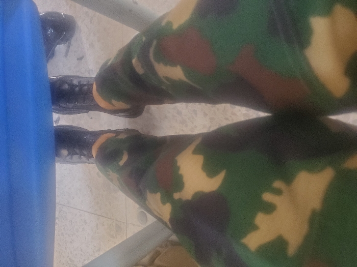The image displays a first-person, downward view of an individual's lower legs and feet in an indoor environment. The subject wears camouflage pattern trousers, consisting of green, brown, and tan colors, paired with black lace-up combat boots. Orange-yellow material, possibly socks or boot lining, is visible above the boot tops. The legs are positioned beneath a solid blue surface, identified as the underside of a table or desk, supported by two light-colored vertical struts. The floor consists of light-toned ceramic tiles with visible grout lines. A solitary, similar black boot is partially visible in the upper right background, suggesting a secondary subject or item. The individual is seated. The specific location within the city of Unknown, Unknown, is not discernible from the visual data.