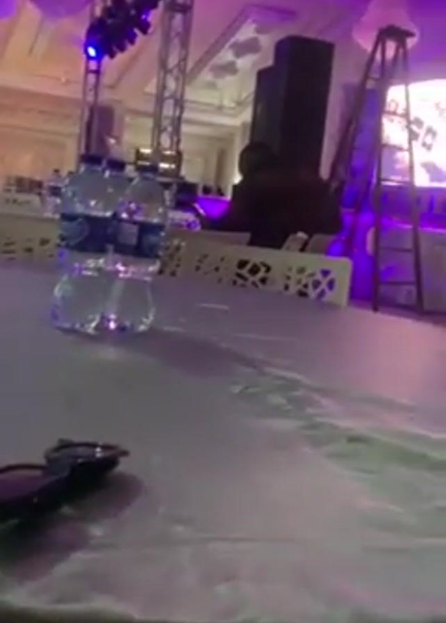 interior of a large, likely event hall with tables and chairs set up, illuminated with purple and white lighting. Two bottles of water and a pair of glasses sit on the foreground table. In the background, a stage is visible with a large screen, and a man appears to be working on or adjusting equipment. Other people are seated at various tables throughout the hall. The hall features decorative elements like chandeliers and ceiling adornments. The camera pans slightly to capture more of the environment.