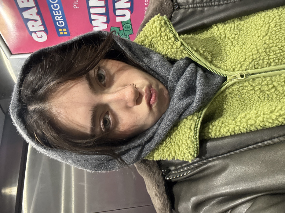 A young person faces the camera with pursed lips. They wear a gray hooded sweatshirt under a zippered, bright green fleece jacket. The jacket's outer layer is a shiny gray material with tan faux fur trim. The person has fair skin, brown hair, and a nose ring. A partially visible advertisement in the background features the words "GREGGS" and "WIN". The image is slightly tilted.