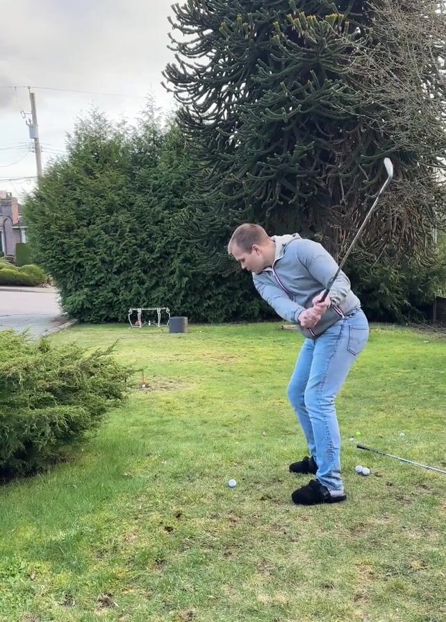 A man is playing golf on a grassy lawn. He's wearing jeans, a gray hoodie, and black slippers. He swings a golf club, hitting a golf ball. Another golf ball and a golf club are visible on the ground. There is a large, unusual tree behind him, as well as a dense green bush and a white metal structure that looks like reindeer. The sky is overcast. A house is visible in the distance.