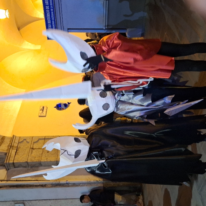 Three individuals in "Hollow Knight" video game costumes stand under a stone arcade at night in Arequipa, Peru