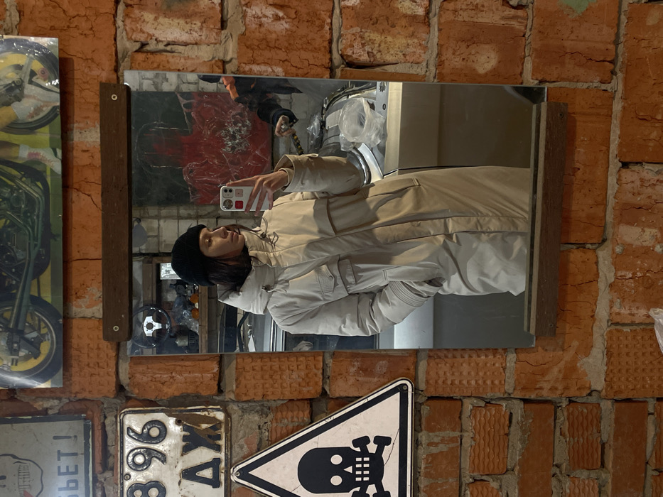 The image depicts an indoor scene, observed in Oktyabr'skii, Russia, characterized by an exposed brick wall in the foreground. Affixed to the brick are a weathered metallic sign featuring Cyrillic text and numbers (e.g., "БЬЕТ!", "896", "ДЖ"), a white triangular warning sign with a black skull and crossbones symbol, and a large print displaying a yellow-wheeled motorcycle. A rectangular mirror with a dark wooden frame is centrally mounted on the wall. Reflected in the mirror is a female individual engaged in taking a selfie. She is dressed in a black knit beanie and a long, light-colored hooded puffer coat with multiple visible pockets. She holds a white smartphone, adorned with decorative stickers, in her right hand, positioning it to capture her reflection. Her left hand is inserted into one of her coat pockets. Her gaze is directed towards the phone. The mirror's reflection also reveals a background environment consistent with a garage or workshop, featuring a steering wheel mounted on a surface, a large abstract red artwork, and visible components of a light-colored vehicle. A second individual, wearing a dark jacket, is partially visible in the lower right quadrant of the mirror, facing away from the camera.