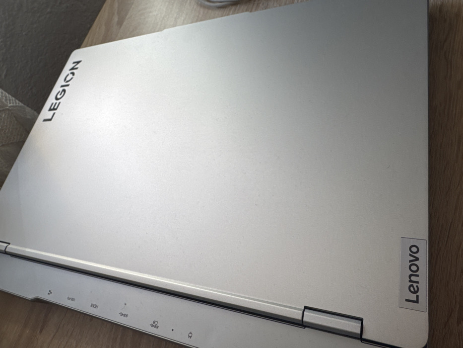 The scene is located in the city of Birkova, Bulgaria. An indoor environment is depicted, featuring a closed, silver-colored Lenovo Legion laptop resting diagonally on a light brown wooden surface, likely a desk or table. The laptop's lid displays "LEGION" in black text on the top right corner and a "Lenovo" brand sticker on the bottom left corner. Along the visible left edge of the laptop, several ports and indicators are present: an unlabeled rectangular port, a USB-C port, an HDMI port, two SuperSpeed USB-A ports, a small indicator light, and another unlabeled rectangular port or slot. The background is a soft-focus, light-colored, textured surface, possibly a wall or curtain. A faint white cable is partially visible on the wooden surface to the right of the laptop. No individuals are present, and no actions or interactions are occurring.