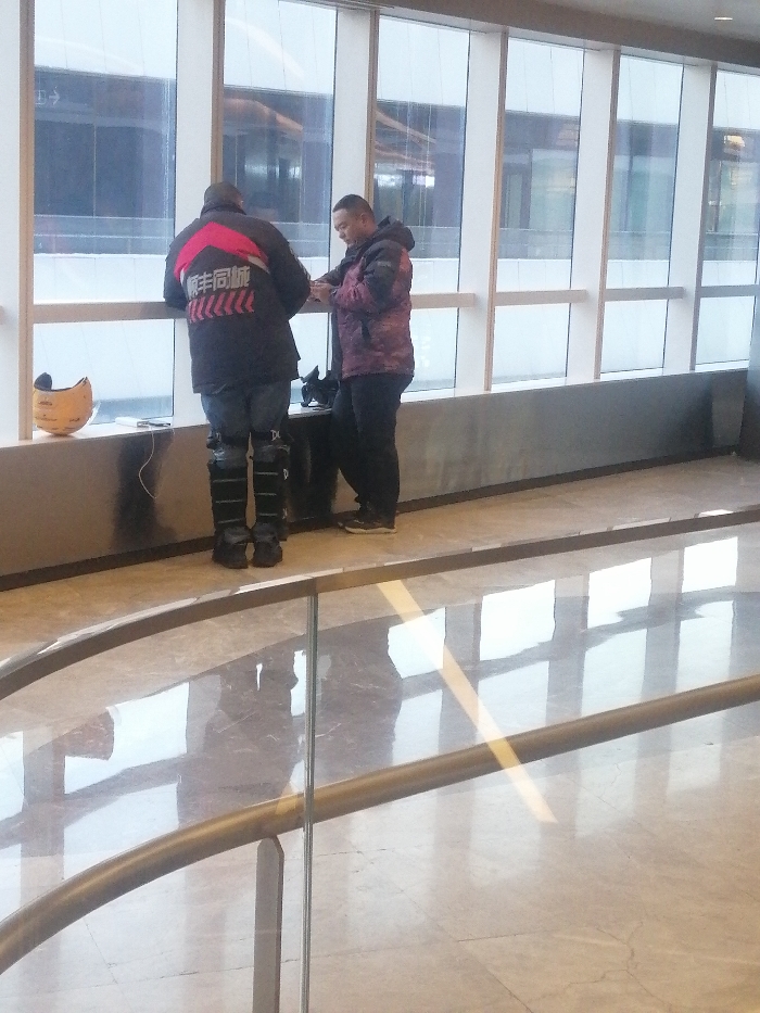 The scene depicts an interior view within a modern building in Fengtai District, China. Two adult males are standing next to a windowed wall. The man on the left wears a dark winter jacket featuring a red chevron pattern and white Chinese characters "顺丰同城" (Shunfeng Tongcheng) on the back, dark trousers, and black protective leg guards. He is positioned with his back partially towards the observer, leaning slightly towards a dark, reflective ledge beneath the windows. To his left, a yellow-orange object, possibly a helmet, and a white cable are resting on the ledge. The man on the right wears a multi-colored, patterned winter jacket, dark trousers, and dark athletic shoes. He is facing the man on the left and appears to be interacting with a mobile device held in his hands, which both individuals are looking at. A dark bag or object is situated on the ledge between them. The floor is polished, light-colored marble, highly reflective, mirroring the windows and the individuals. A glass and metal railing system is visible in the immediate foreground, suggesting an overlook or split-level floor. The exterior visible through the windows shows indistinct architectural structures of an urban environment.