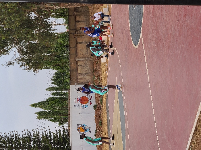 The image displays an active outdoor basketball court in Jos, Nigeria, under an overcast sky