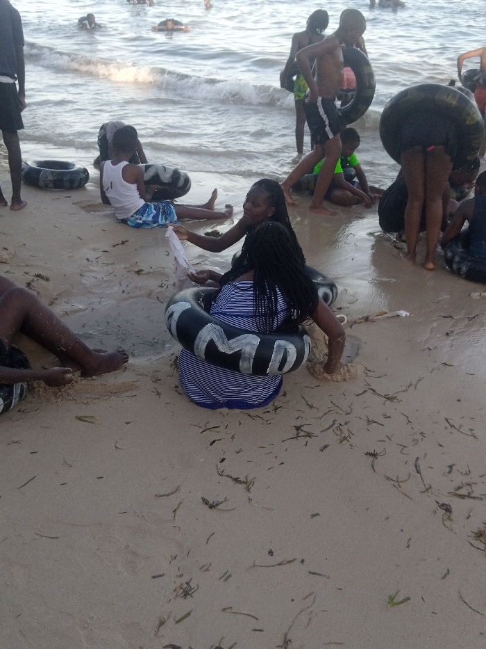 - "The scene depicts a group of approximately 15-20 individuals, predominantly children and young adults, engaging in recreational activities on a sandy beach in Shanzu ward, Kenya" by FM-vsiag2, licensed under CC BY 4.0