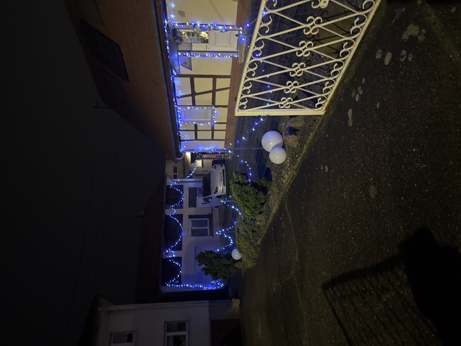 A house is decorated with blue Christmas lights, outlining the roof and windows. Two white spheres sit along the edge of a concrete walkway in front of the house. A white wrought-iron gate is partially visible on the right. A small shrub stands near the spheres. Another house is visible in the background, also adorned with blue lights. The scene is at night, and the sky is dark.