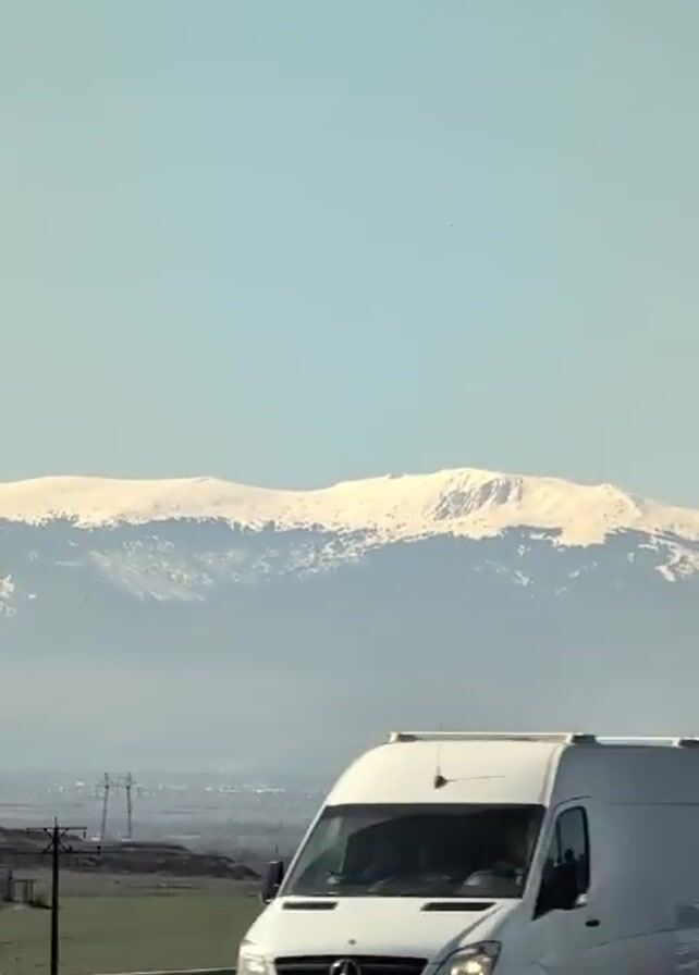 view from a moving vehicle driving along a road. The camera is pointed at a snow-capped mountain range in the distance under a bright blue sky. In the foreground, there is a highway guardrail, followed by a green field with utility poles. A billboard with the words "My Silver" is briefly visible. Cars drive on the road. The overall impression is of a clear, sunny day.