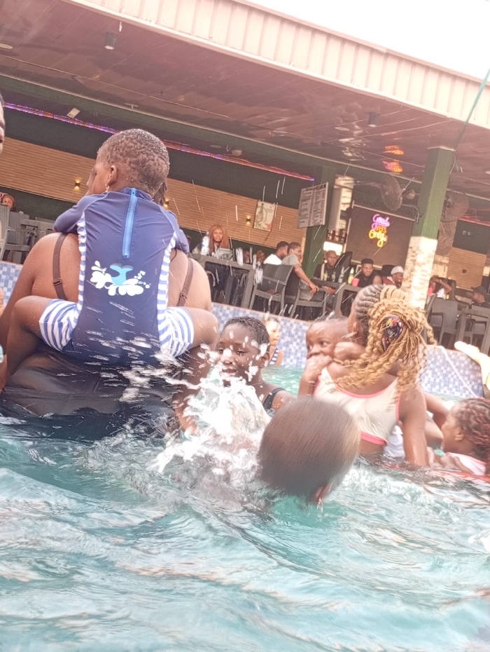 Several people are swimming in an outdoor pool. A woman wears a child on her shoulders, the child in a blue swimsuit with a whale on the back. Other children are in the water, some near adults. A building with people seated at tables is in the background, under a flat roof with lights and fans. The atmosphere is lively and casual.