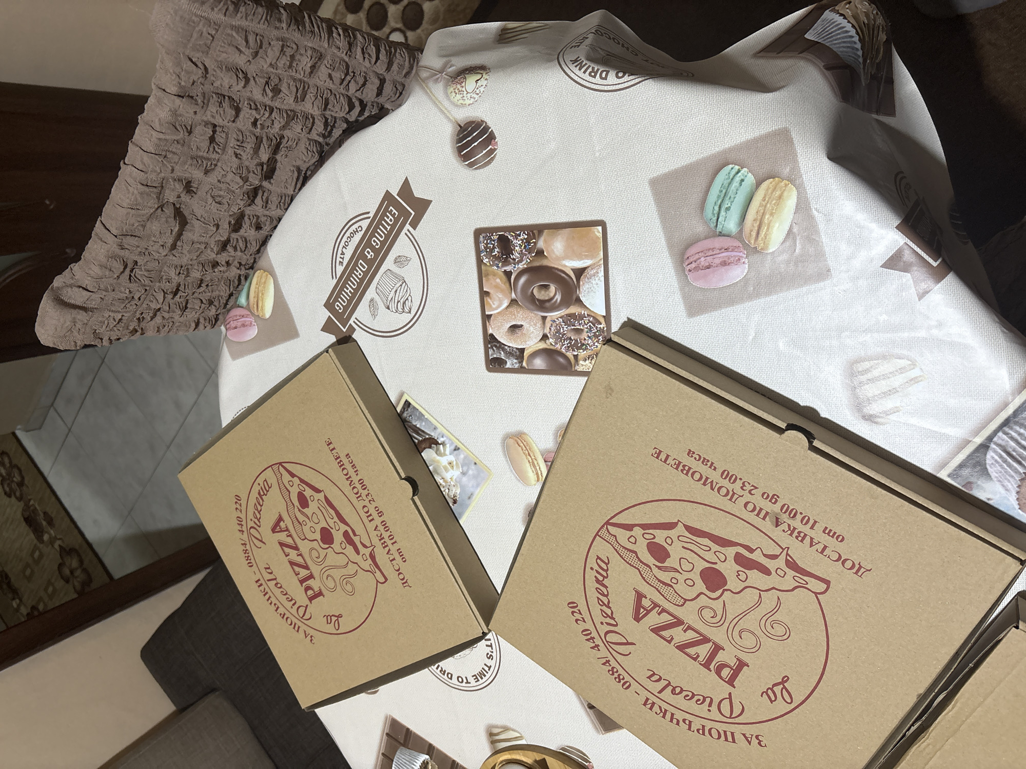 The scene depicts an indoor setting, likely a dining area, in Montana, Bulgaria. Two rectangular, unsealed cardboard pizza boxes, each bearing the "La Piccola Pizzeria" logo in red, are centrally positioned on a light-colored tablecloth. The logo includes a stylized pizza slice and Bulgarian text: "ЗА ПОРЪЧКИ - 0884/ 440 220" (For Orders) and "ДОСТАВКА ПО ДОМОВЕТЕ от 10.00 до 23.00 часа" (Home Delivery from 10:00 to 23:00 o'clock). The tablecloth is patterned with brown graphic designs of various desserts, including cupcakes, donuts, and text banners such as "EATING & DRINKING" and "CHOCOLATE". Several decorative elements resembling dessert photographs or cutouts are scattered on the tablecloth: a rectangular image displaying multiple glazed and sprinkled donuts, three individual macarons (pink, mint green, and light yellow) arranged on a small square of parchment-like paper, an additional single beige macaron, and two small round objects resembling decorated cake pops on sticks. A brown, textured fabric chair back occupies the right side of the frame, while a grey upholstered sofa or cushion is partially visible on the left. A dark wooden furniture piece and a patterned rug are discernible in the blurred background. No individuals are present in the image.