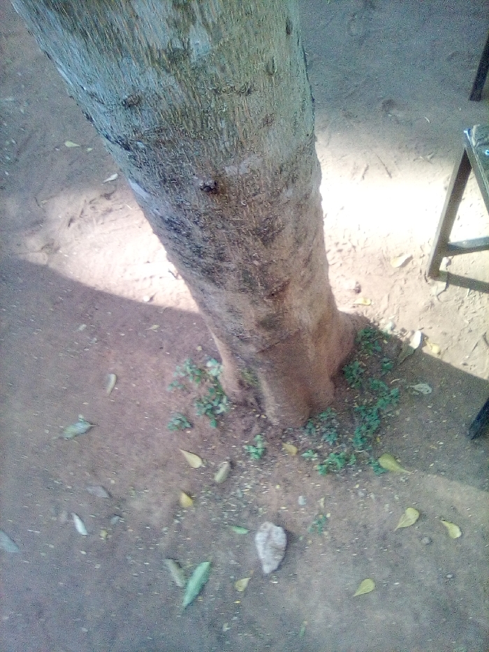 The scene depicts an outdoor ground-level view in the city of Bondo, Kenya, featuring the lower section of a tree trunk