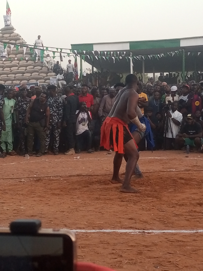Two shirtless men wrestle in a dirt arena surrounded by a crowd. The man in the foreground wears a red skirt. Spectators fill the background, some under a covered structure decorated with pennants. A platform made of stacked sacks stands on the left, with people standing on top. A camera is partially visible in the lower left corner, suggesting someone is recording the event.
