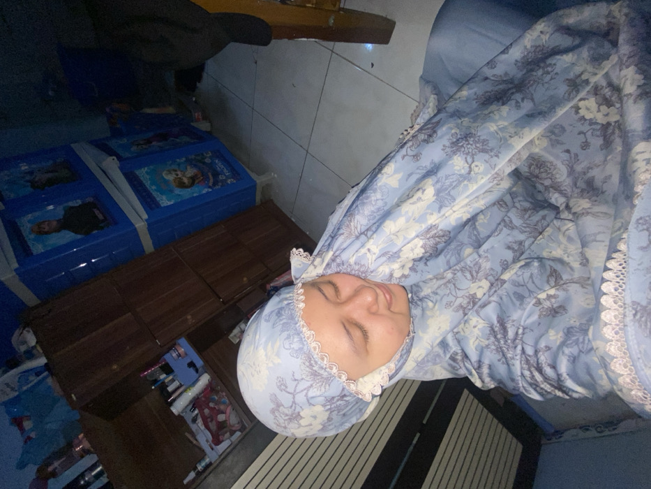 An indoor scene in Gelam, Indonesia, depicts an individual, presumably female, situated in what appears to be a residential room. The person is dressed in a light blue prayer garment (mukena) featuring a white and gray floral pattern, with white lace trim along the edges of the head covering (hijab) and the main body garment. The individual's face is visible, with eyes directed downwards, and a faint, serene expression. In the background, to the left of the individual, a multi-drawer brown wooden cabinet or dresser is visible, topped with various personal care bottles and containers. Further left, a light-colored slatted surface, possibly a window blind or part of furniture, is present. To the right, two blue plastic storage cabinets, each adorned with "Frozen" animated movie characters, are stacked vertically. The floor beneath these cabinets is composed of light-colored square tiles. A dark, indistinct object is partially visible on the far right edge of the frame.