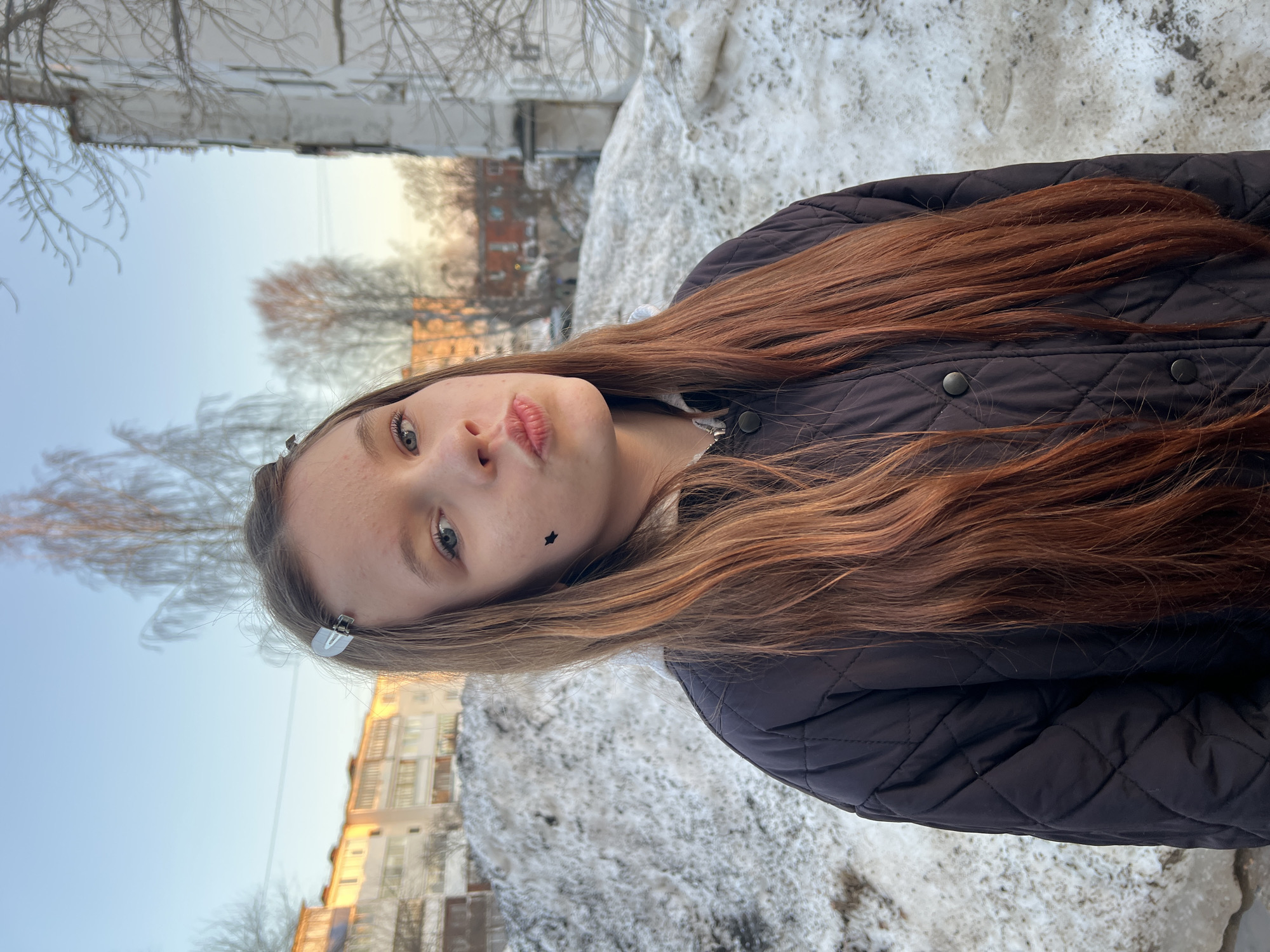 A young, light-skinned person with long, light brown hair tinged with red stands outdoors in front of a snow-covered area. They are wearing a quilted dark brown jacket and have a small star sticker on their cheek. The person is looking directly at the camera with a slight pout. Behind the person, partially visible, are buildings of the city of Noviy, Russia. The time appears to be early morning or late afternoon, with soft sunlight illuminating the buildings. Bare trees are also visible. The exact location within Noviy, Russia is not definitively discernible.