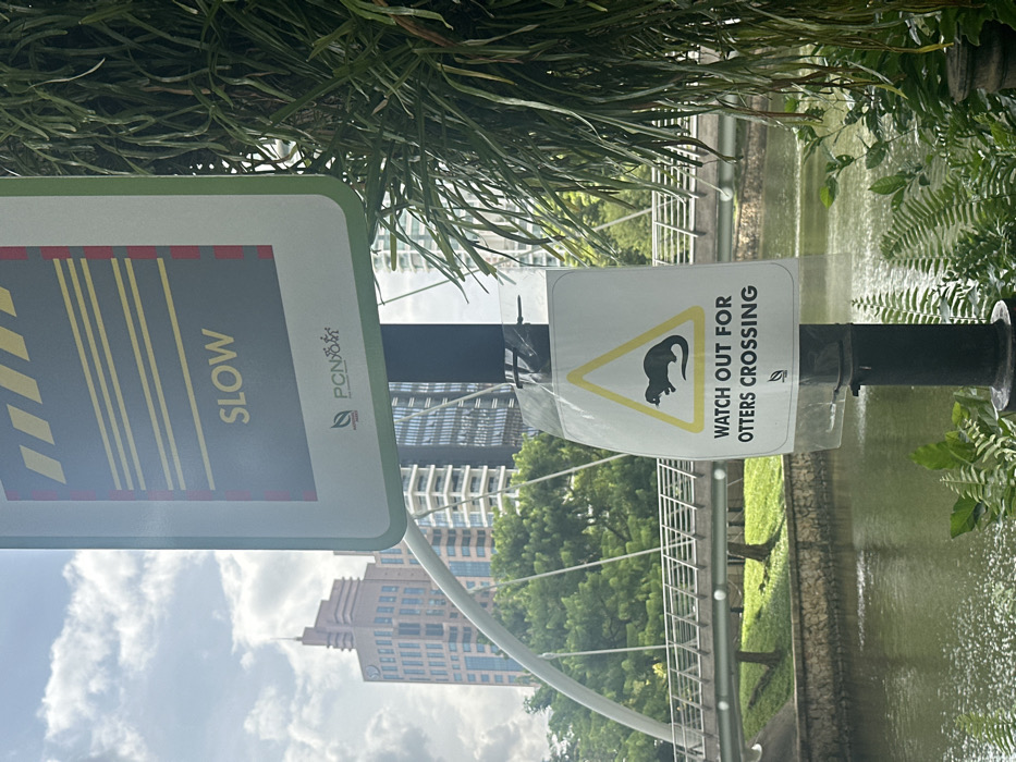 The image captures a daytime scene along the Park Connector Network adjacent to the Kallang River in Singapore. In the foreground, a black metal pole stands centrally, displaying two laminated signs. The upper sign is rectangular, featuring a grey field with four yellow horizontal dashed lines and the word "SLOW" in yellow. It includes a thin red border, green trim, and "PCN" (Park Connector Network) logos depicting a leaf, a bicycle, and a walking person. Below it, a smaller rectangular sign is taped to the pole with clear plastic. This sign presents a yellow triangular warning symbol containing a black silhouette of an otter. Below the triangle, the text "WATCH OUT FOR OTTERS CROSSING" is printed in black, accompanied by a small green leaf logo. In the mid-ground, a greenish-brown urban waterway (river or canal) flows. Across the water, a modern pedestrian bridge with a distinctive light-colored arched support and horizontal railings spans the waterway. Lush green trees line the opposite bank beyond the bridge. In the distant background, several high-rise buildings pierce the skyline, including a prominent reddish-brown structure with stepped upper levels and other contemporary glass and steel towers. Dense green foliage, including ferns, is visible in the right background and foreground. The sky is partly cloudy. No individuals are visible in the scene.
