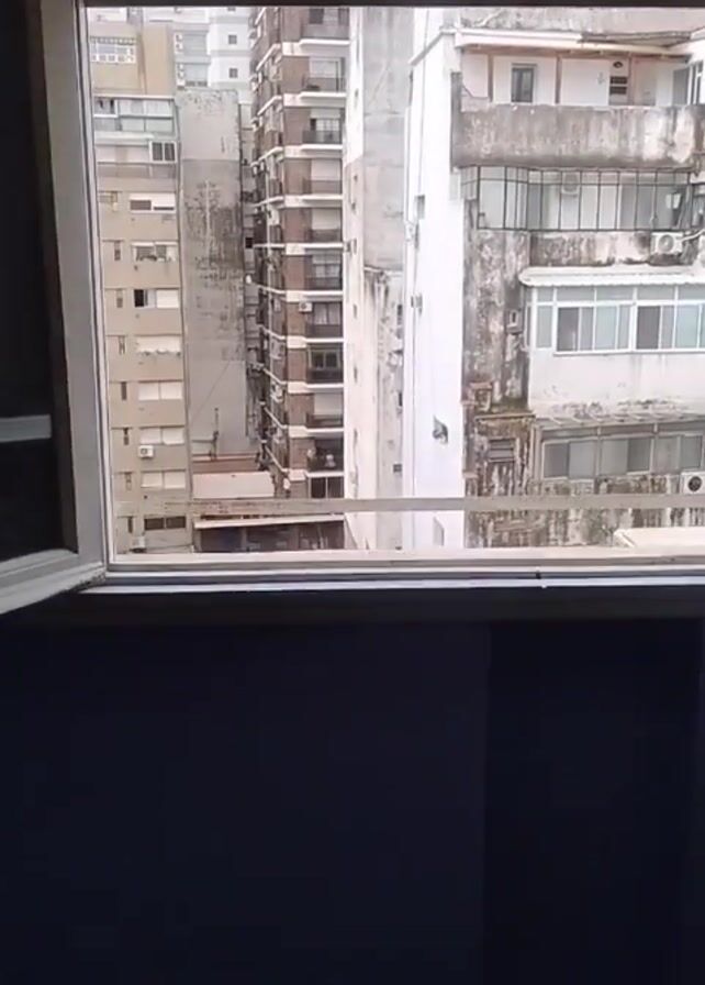 The video begins with a view from inside a room, looking out a window with closed blinds