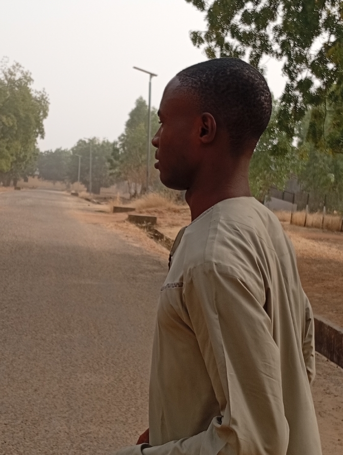 A man stands in profile, facing left, on a paved road. He wears a light brown, long-sleeved shirt. The road stretches into the distance, lined with trees and streetlights. Additional trees and foliage frame the background and right side of the image. The sky appears overcast, contributing to the muted color palette. The image seems to be taken outdoors, possibly on a university campus or park.