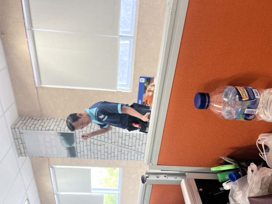 A man in a blue shirt is holding a stick. He is next to a faux brick wall with a motivational poster. Two windows with blinds are visible. An orange cubicle wall is in the foreground with a water bottle, office supplies, and plastic bag. The scene is brightly lit.