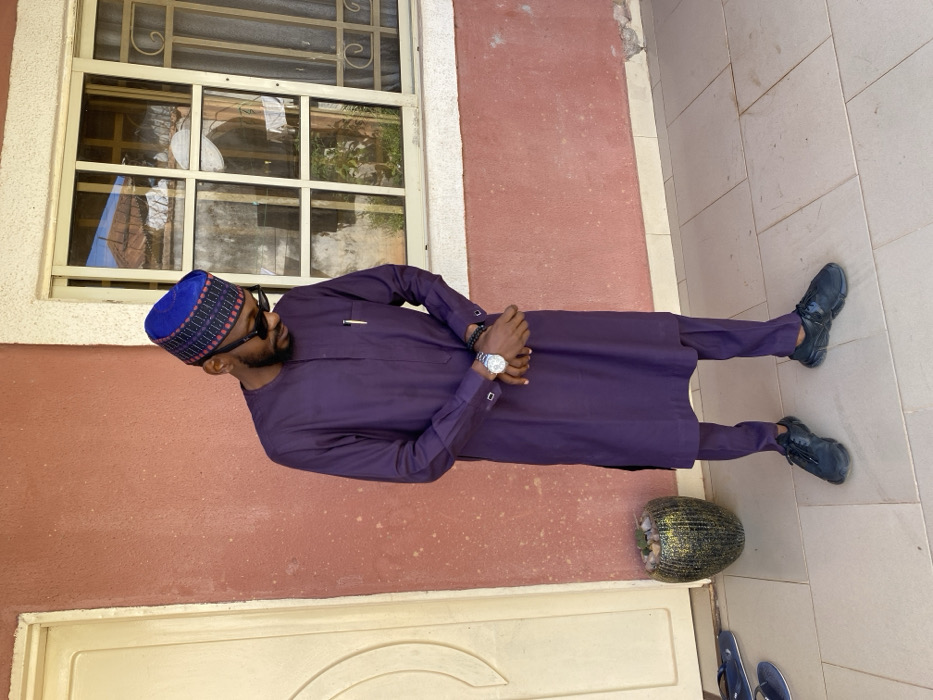 An adult male stands outdoors in Sabon Tasha, Nigeria, positioned in front of a light reddish-brown stucco wall and a cream-colored door