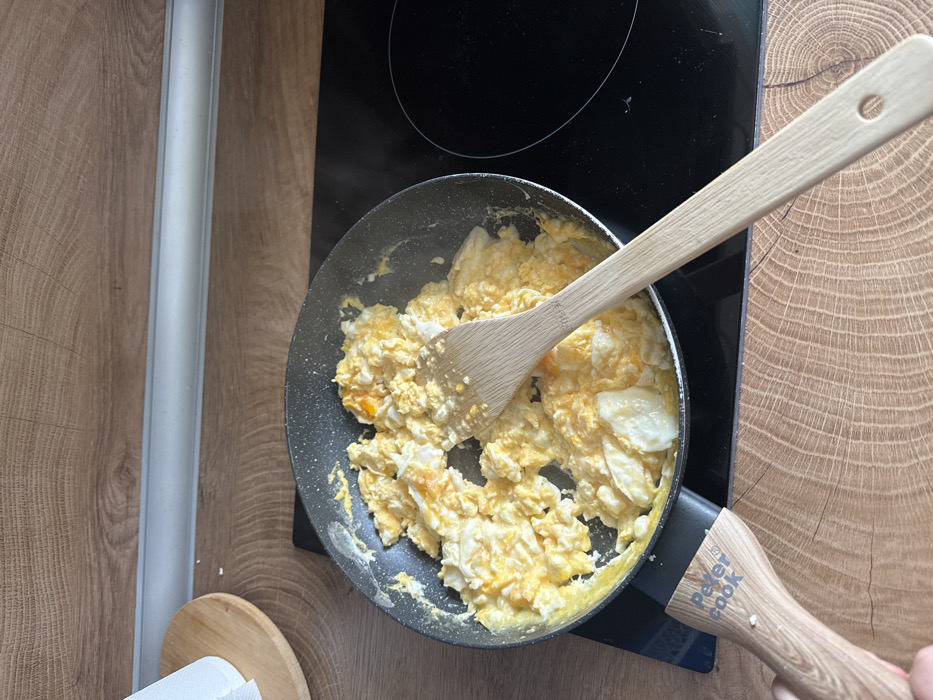 The image displays a close-up, high-angle view of scrambled eggs being cooked in a kitchen located in Tsarevo, Bulgaria