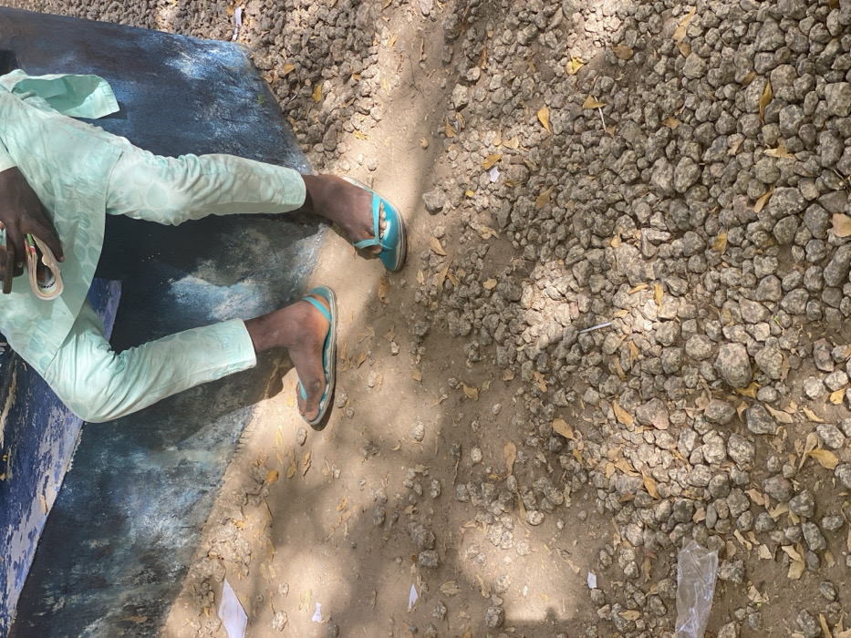 The image captures the lower body of an individual seated outdoors in Dabawa, Nigeria