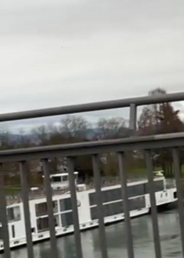 white river cruise ship passing by on a river. The view is from a bridge, and the gray metal railings of the bridge are in the foreground. Behind the ship, on the riverbank, there are trees, a green field, and a building with a tall steeple. The sky is overcast. The video appears to be taken from a moving vehicle.