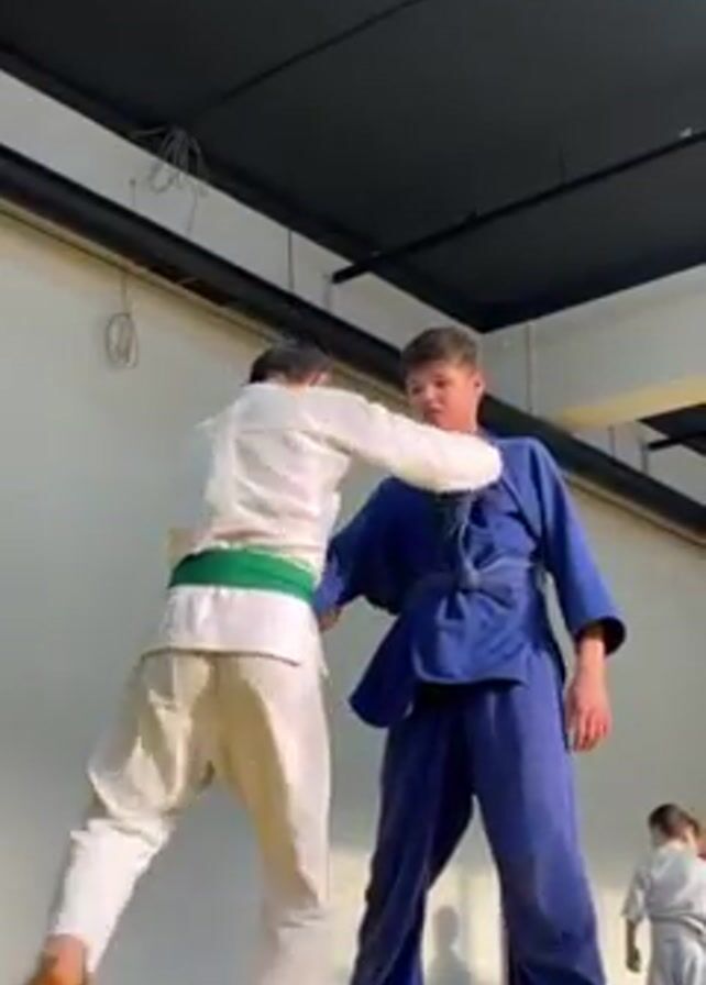 Two young people, one in a white judogi with a green belt and the other in a blue judogi, are grappling on a yellow mat in what appears to be a judo training room