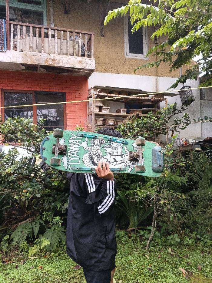 - "An individual, visible from the chest down, holds a worn, light green skateboard horizontally above their head, obscuring their face" by FM-4Sqr83, licensed under CC BY 4.0