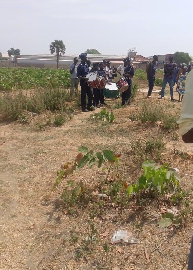 A distant marching band, dressed in blue uniforms and black caps, marches across a field next to a cultivated plot of green plants. The view is partially obscured by a man in a light-colored long-sleeved shirt and jeans, who is either watching or ignoring the scene. The ground is mostly dry and yellow, scattered with small plants and debris. The sky is light with a few clouds. The video is vertically oriented.