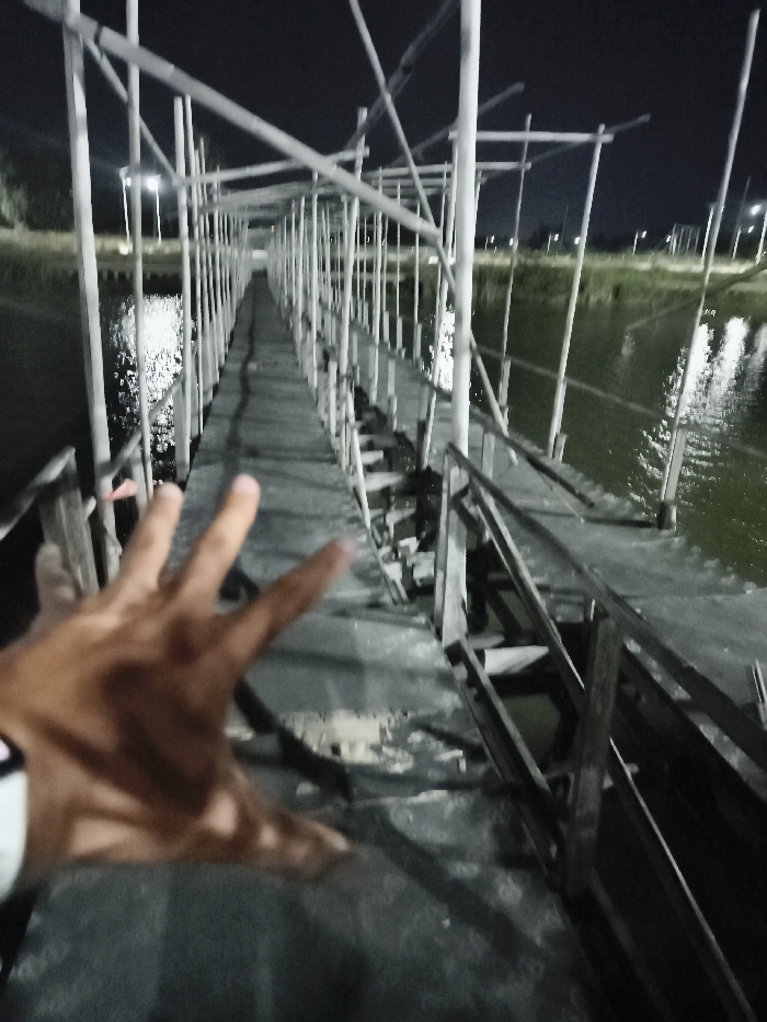 The image depicts a nighttime scene at a long, narrow pedestrian walkway or pier extending over a body of water in Baan Chaweng, Thailand. The walkway, constructed from dark-colored planks or concrete slabs, appears to be under construction or in a state of disrepair, with sections on the right side showing significant damage, including missing planks and exposed underlying support structures. Numerous light-colored vertical poles, likely bamboo or lightweight scaffolding, form a canopy-like structure above and alongside the walkway, acting as temporary supports or a partial framework. On both sides of the walkway, a dark body of water reflects distant artificial lights, indicating ambient illumination from an unseen source. Beyond the water, faint lights suggest distant land or development. In the immediate foreground, a brown-skinned human hand is prominently positioned, blurred and extended forward towards the walkway with fingers splayed open. A white band, possibly a watch or wristband, is visible on the wrist. The overall lighting is dim, relying on reflections and distant light sources.