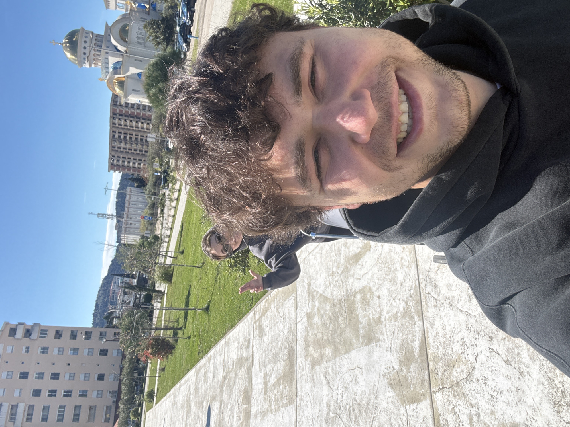 A selfie taken outdoors depicts a young man with curly brown hair and a black hooded sweatshirt smiling slightly with squinted eyes
