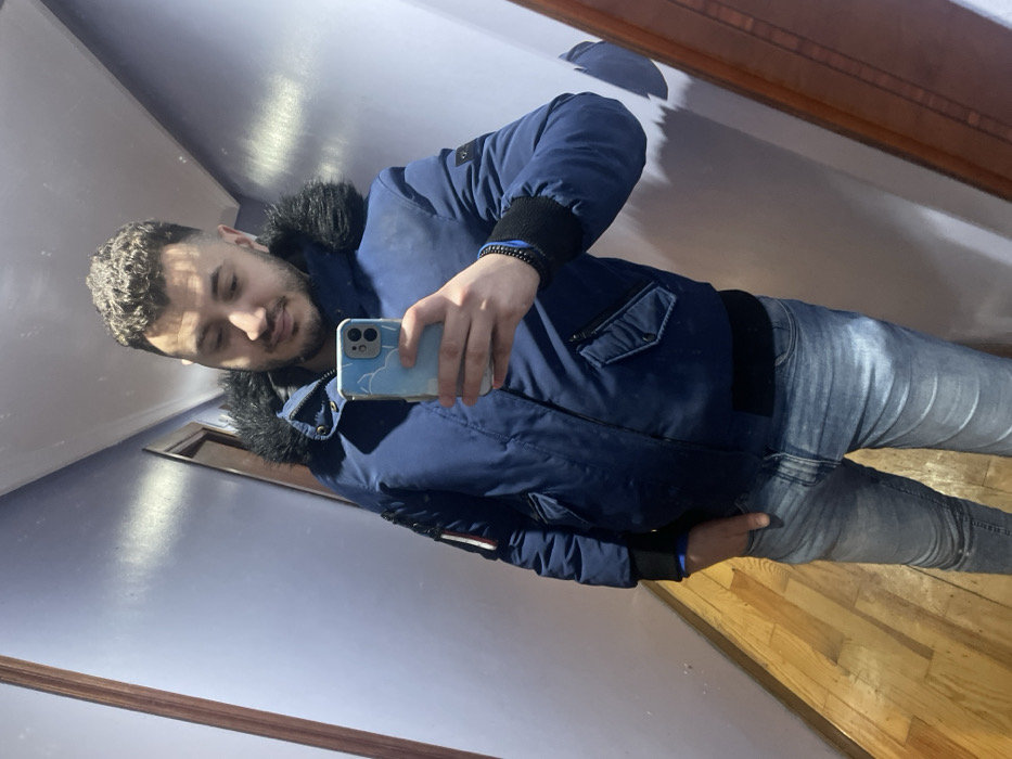 An individual is depicted taking a mirror selfie in what appears to be an indoor hallway within a residential or domestic setting in Azpeitia, Spain. **Subject:** A male, appearing to be in his 20s or 30s, with short, dark, curly hair and a short beard/stubble. He is looking downwards, towards the phone or his reflection, with a neutral to slight smile. He holds a light blue or white smartphone with a dual-camera system in his right hand, positioned in front of his torso. His left hand is partially inserted into the front pocket of his jeans. **Attire:** He wears a dark blue, insulated jacket with a black faux fur-lined hood. The jacket features black ribbed cuffs and waistband, a small red, white, and blue striped patch on the upper left sleeve, and zippered pockets on the lower front. Beneath the jacket, a black top is visible. He is wearing light blue, distressed denim jeans. A black beaded bracelet is visible on his left wrist. **Environment:** The reflection reveals a narrow interior space, likely a hallway. The walls are painted a pale lavender or light purple color. The floor consists of light-toned wooden planks, exhibiting visible grain patterns. A dark wooden door frame is visible on the left, leading to an obscured area, possibly a room or further down the hallway. On the far right, a dark brown wooden door frame is partially visible. The lighting is artificial, illuminating the scene from above.