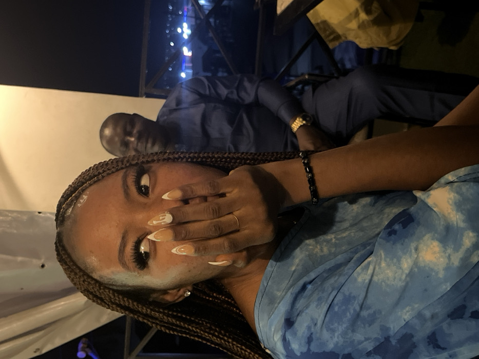 A young woman with braided hair and manicured nails covers her mouth with her hand, looking at the camera