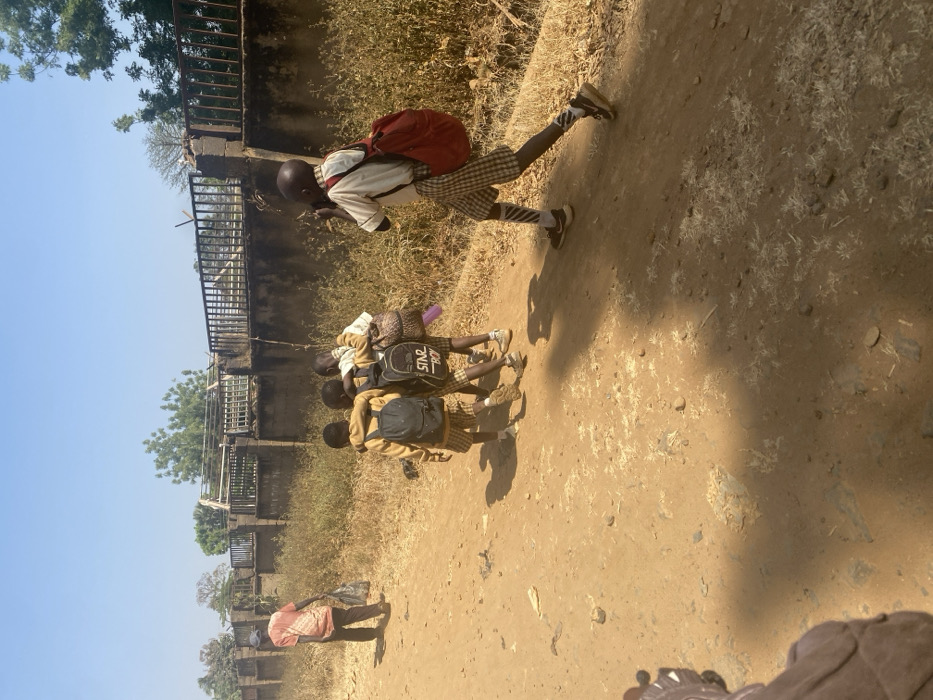 The image portrays an outdoor scene in Takau, Nigeria, under clear daylight conditions. A reddish-brown dirt path occupies the foreground and mid-ground. Four children, identified as students by their uniforms and backpacks, are present on the path. Three children walk closely together from left to right in the mid-ground, all wearing light-colored shirts and plaid shorts. Two of these children carry dark backpacks; one backpack is labeled "STAR BOY," and the third child carries a patterned bag with a purple water bottle attached. One child in this group has an arm around another. A fourth child, also in a light shirt, plaid shorts, and white and black striped socks, carries a red backpack and is depicted running ahead to the right of the main group. In the far left background, an adult male wearing an orange-patterned shirt, dark trousers, and a blue cap walks away from the viewer, carrying a dark bag. The path is bordered by dry, sparse vegetation on the right side. A concrete wall topped with a dark metal fence extends horizontally across the background, behind which green trees are visible against a clear blue sky.