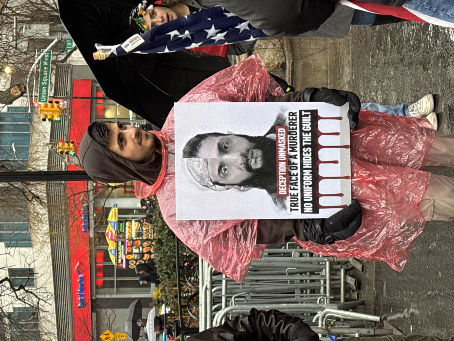 A person in a hooded rain poncho holds a sign with a split image of a man, one half with a head covering and the other without. Bold text declares, "DECEPTION UNMASKED TRUE FACE OF A MURDERER NO UNIFORM HIDES THE GUILT," with blood-like drips. The person holding the sign is in front of Union Square West and E 14th street. An American flag is visible behind the sign and person holding it. The scene appears to be a protest or demonstration.