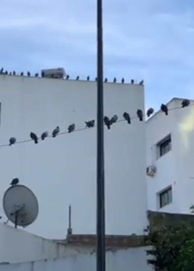 large number of pigeons in an urban environment. Pigeons are perched on wires and rooftops of buildings. Some are flying. The buildings are white, red, and grey. The sky is blue. There is vegetation below the buildings. A street light is visible in the foreground.