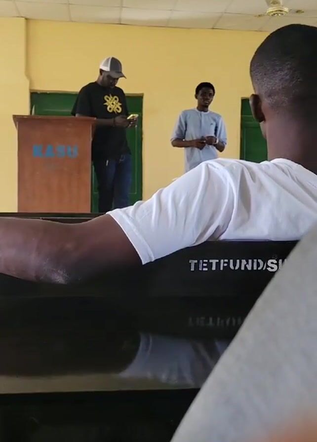classroom setting with two men on a stage. One man stands at a podium labeled "KASU", looking at his phone. He is wearing a black shirt with a yellow design, a grey baseball cap, and jeans. Another man in a light blue shirt stands behind him, facing the audience. The room has pale yellow walls and a drop ceiling with a ceiling fan. The camera is positioned from the back of the classroom, focusing on the back of a man wearing a white t-shirt and partially showing another person in a grey shirt. The seat in front of the camera has the word "TETFUND/ST" written on it. The scene appears to be a lecture or presentation taking place in a university classroom.