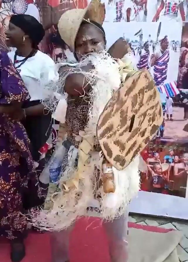 A man in traditional clothing dances on a red surface in front of a backdrop. The backdrop is decorated with images of drums and people in traditional attire. The dancer wears a straw hat, white fringe covering his torso, and a patterned brown shield. He is surrounded by other people, including a woman in a purple patterned dress. A water bottle is visible hanging from his costume. The dancer moves slowly, holding his shield and looking towards the camera.