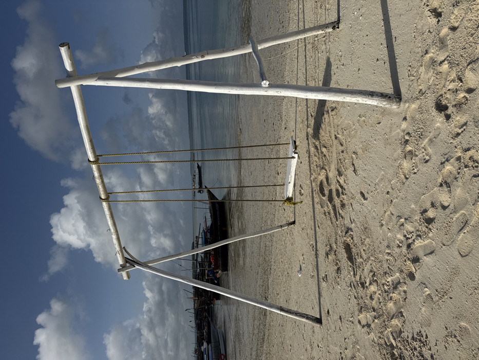 A white swing set stands on a sandy beach, its ropes dangling above a wooden seat. Fishing boats line the shore behind the swing, partially obscured by the swing's frame. Footprints dot the sand around the swing set. The sky, with scattered clouds, forms the backdrop.