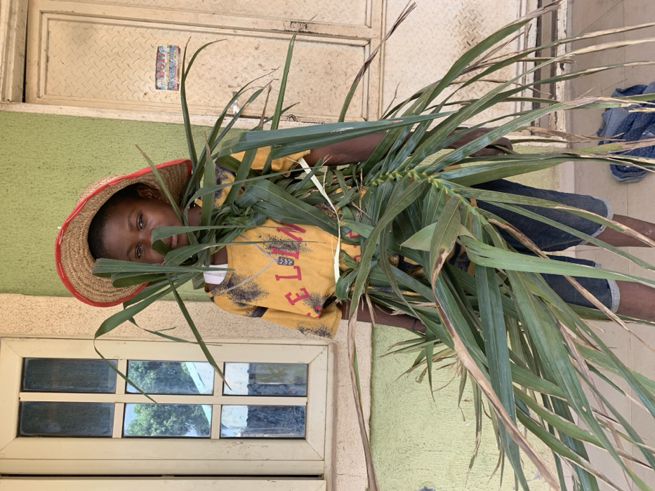 An individual, appearing to be a young person, stands centrally, partially obscured by green foliage, in an unknown location in a city. The person wears a straw hat with a red brim, a yellow long-sleeved shirt with black and red markings, a silver-colored necklace with a rectangular pendant, and dark denim shorts. Long, green plant leaves, resembling palm fronds, are arranged around the person's torso and arms, forming a dense covering that partially conceals their face. Some leaves exhibit browning tips. The background features a muted green wall. To the left, a light-colored window frame with multiple panes reflects sky and distant trees. To the right, a light brown metal door with a diamond plate pattern and an indistinct sticker is visible. The ground is a light-colored concrete surface, with a crumpled piece of dark blue fabric situated to the person's right. The scene is brightly illuminated by natural light.