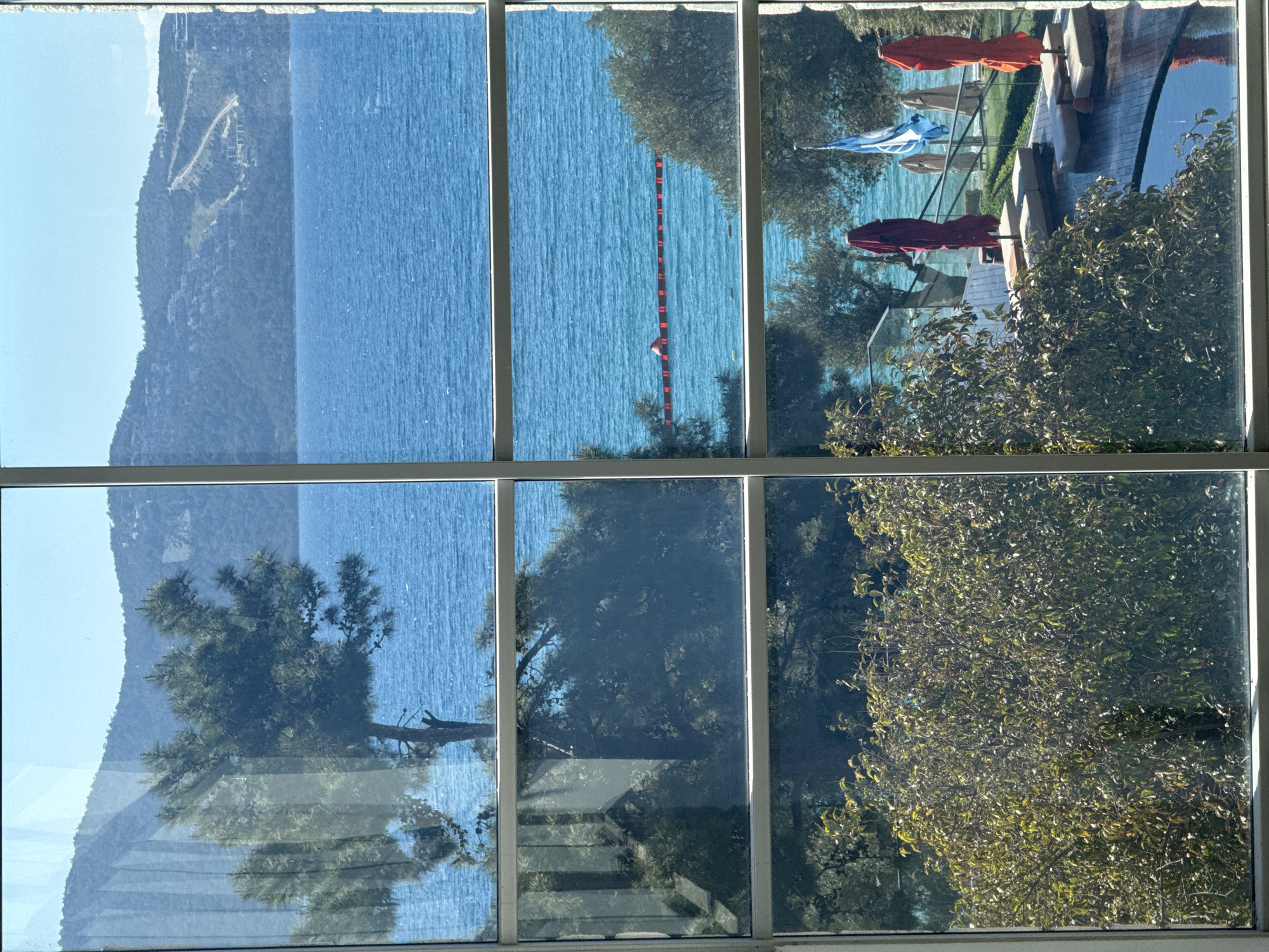 View from a window in Bodrum, Turkey: The scene is framed by a window with six panes