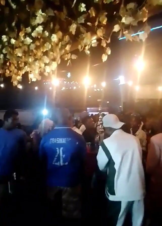 A crowd of people gathers indoors at a bar. Light fixtures and faux foliage decorate the ceiling. People stand and mill about while the camera moves through the space. There are bottles behind the bar and people are holding beverages.