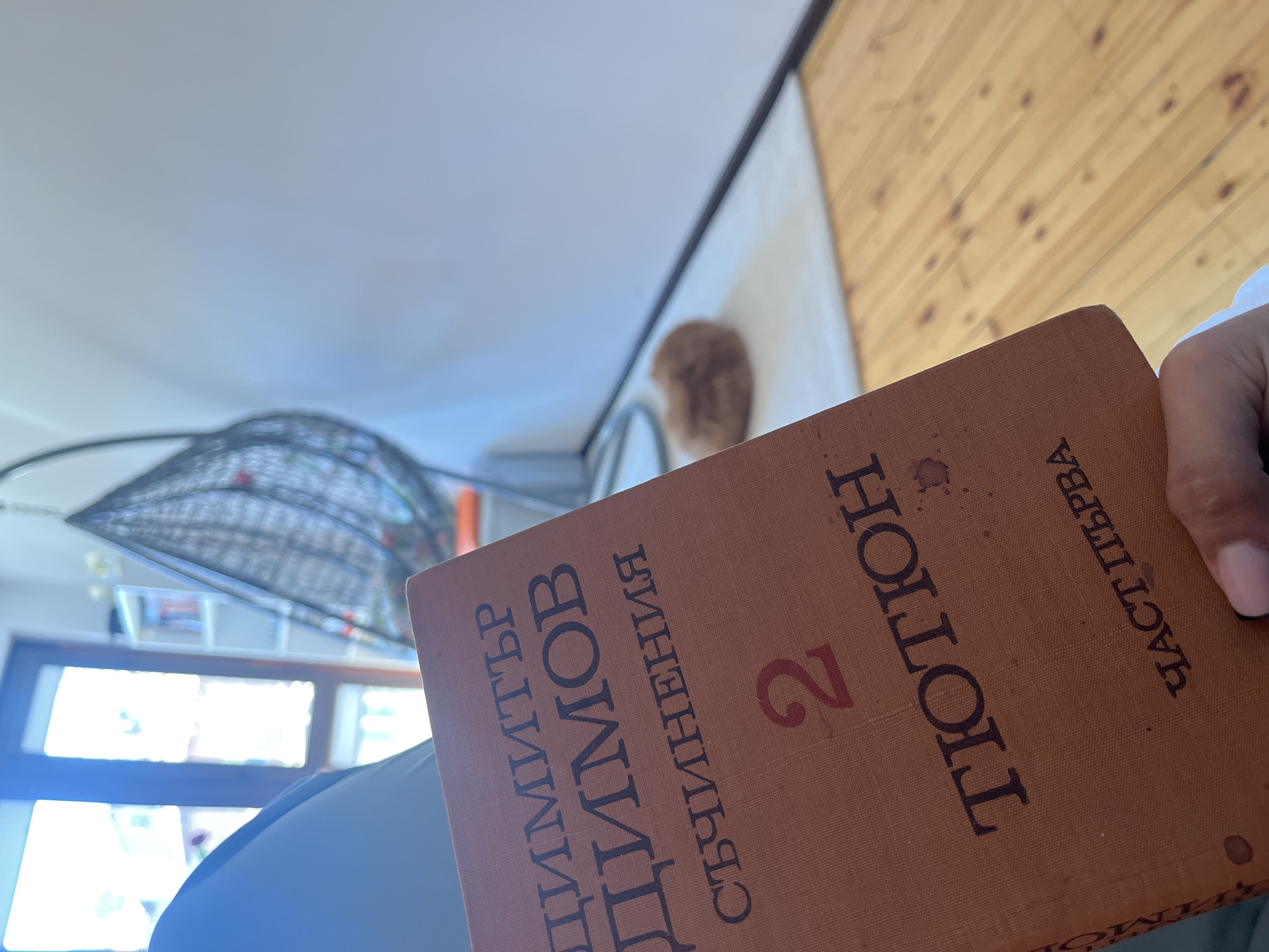 The image features a close-up shot of a book titled "ТЮТЮН 2 ЧАСТ ПЪРВА" (Tobacco 2 Part One) by Димитър Димов (Dimitar Dimov). The book has a worn, brown cover with black text. A person's hand is partially visible, holding the book. The background is out of focus, but appears to include interior elements such as a window, a wicker chair, and wood paneling on the wall. The presence of Bulgarian text suggests the location might be in Bulgaria. The city of Pernik is not readily identifiable from the image.