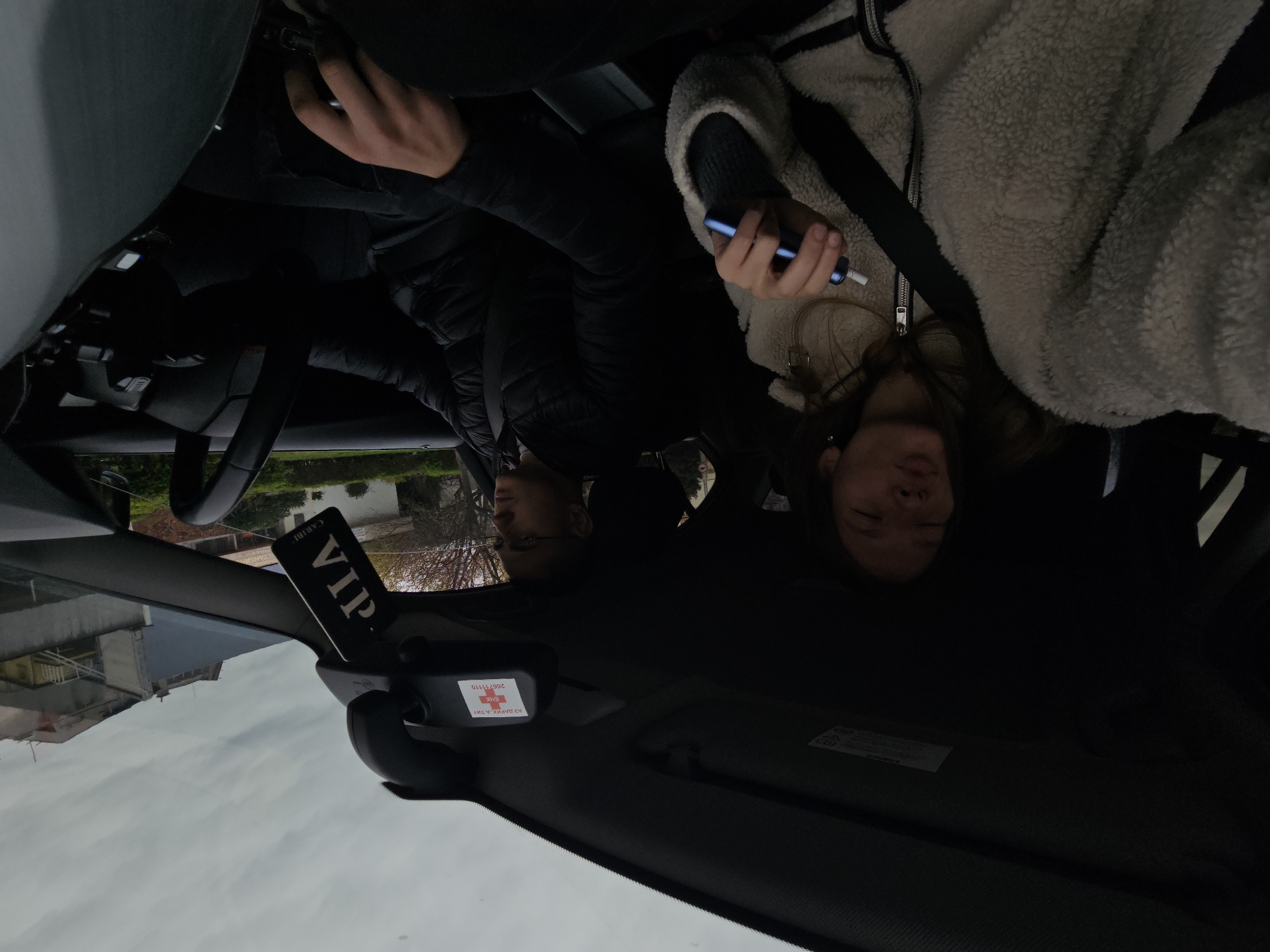Two people are inside a car. One person is wearing a light-colored fleece jacket and holding a blue electronic device. The other person is wearing a black jacket. The car has a "VIP" tag hanging from the rearview mirror and a sticker with a red cross. Outside the car, buildings can be seen, suggesting an urban environment. The location is implied to be Plovdiv, Bulgaria.