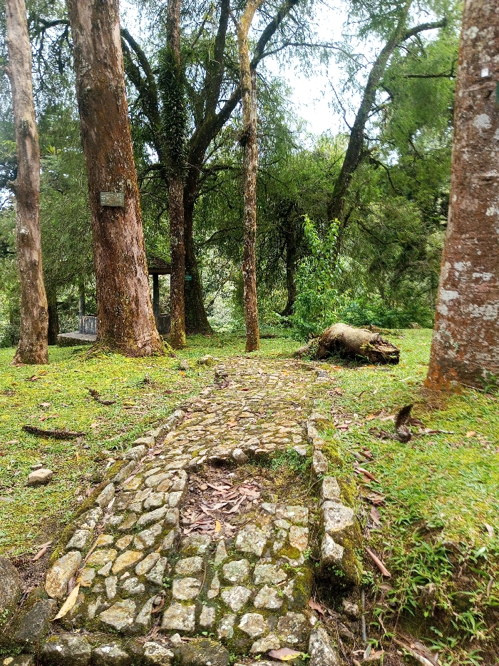 The image displays a forested or park-like environment in Padegaon, India. A narrow, irregular cobblestone path, partially covered in moss and dry leaves, extends from the foreground into the middle ground, curving gently to the left. The ground on either side of the path is covered with green grass and scattered foliage. Numerous tall trees with rough, textured bark, some exhibiting moss or climbing vines, rise throughout the scene, forming a dense green canopy in the background. A small, open-sided structure, possibly a gazebo or shelter, with a roof and supporting pillars, is partially visible amongst the trees in the left-center background. A small, rectangular sign or plaque is affixed to the trunk of a large tree to the left of the path. To the right of the path, a large, weathered log or tree stump rests horizontally on the grass. No individuals or animals are visible within the frame. The lighting is diffused, suggesting an overcast sky or dense overhead foliage.
