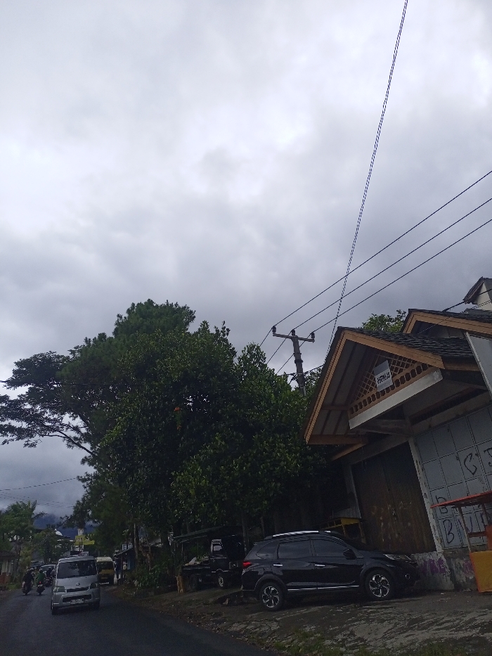 A street scene on a cloudy day shows a silver van approaching on the left side of the road. To the right, a black SUV is parked next to a building with a wooden frame. Utility poles and wires stretch across the sky above trees and the building. A hint of mountains can be seen in the distance. The overall scene appears overcast and possibly damp.